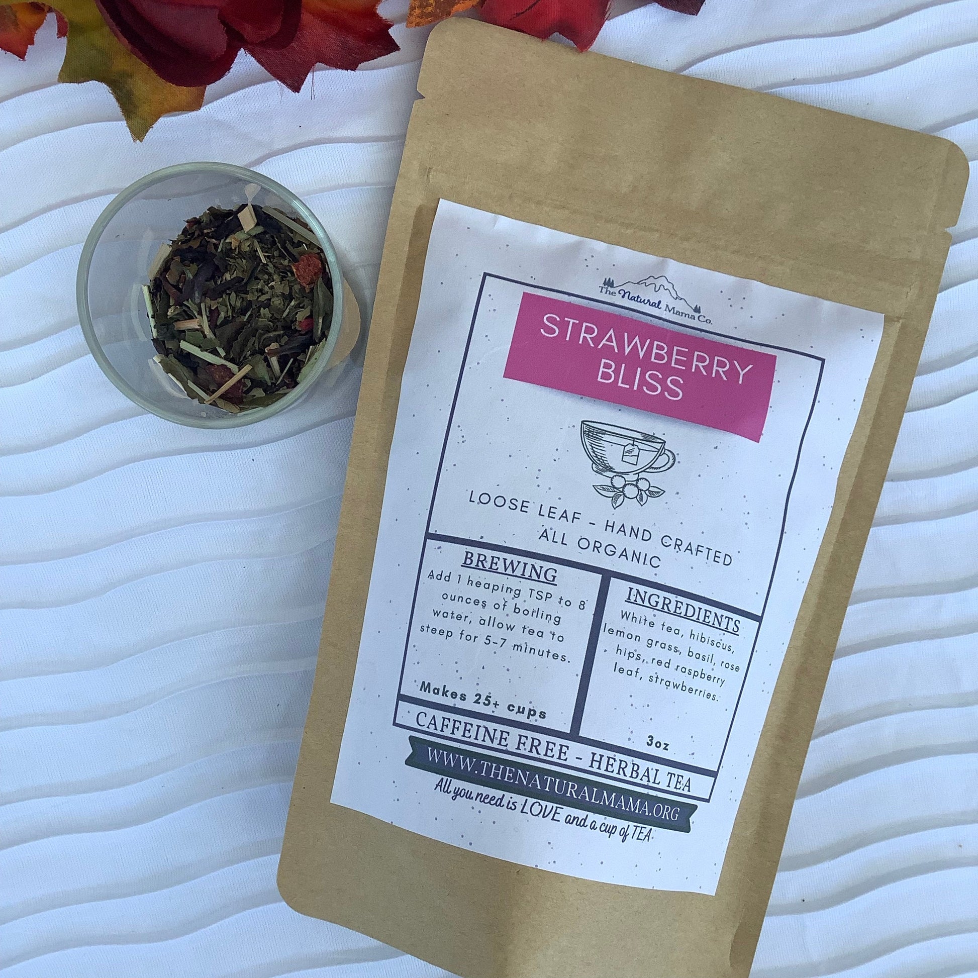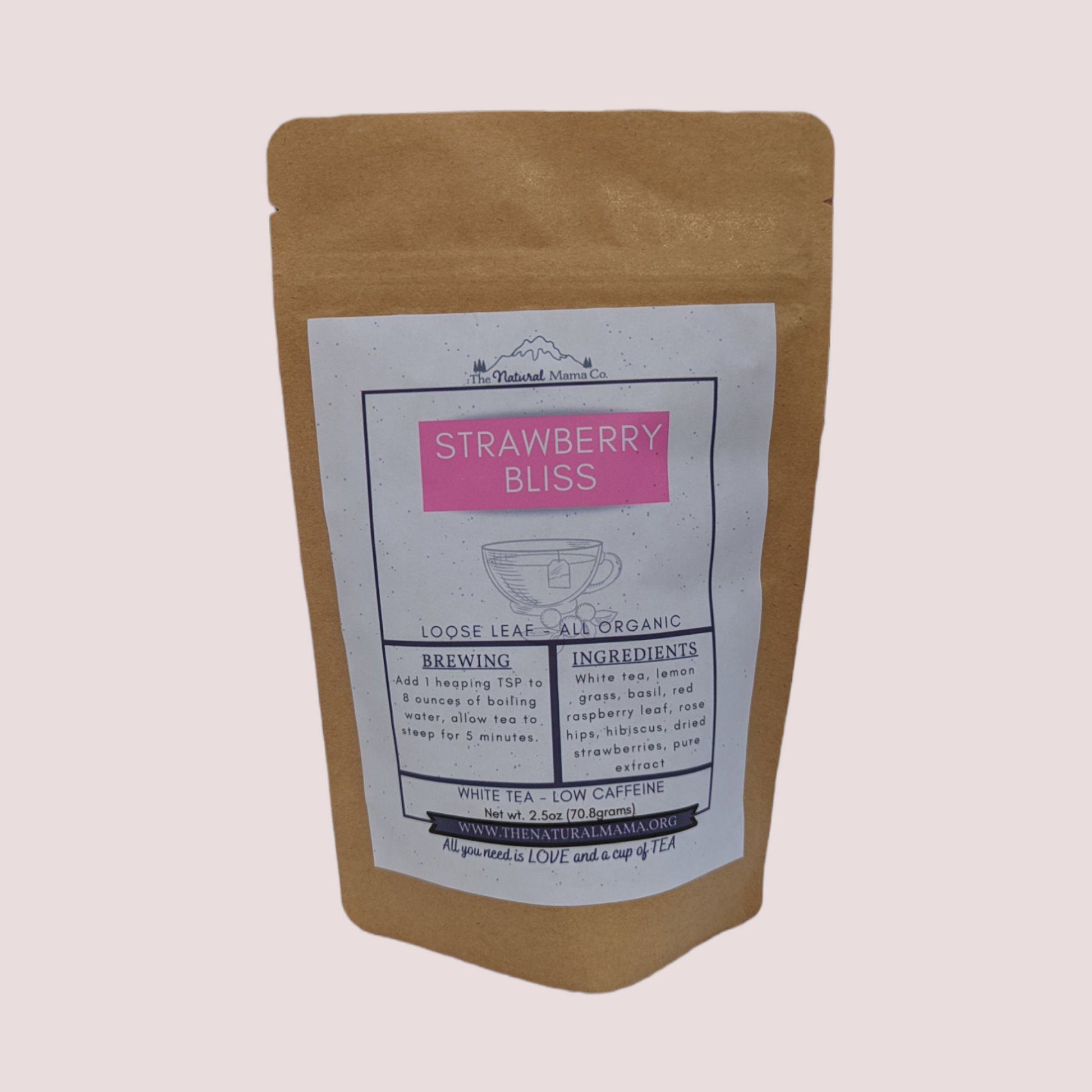 Ingredients: White tea, lemongrass, basil, red raspberry leaf, rose hips, hibiscus, dried strawberries, pure extract.